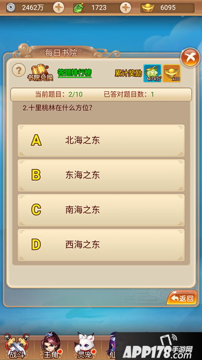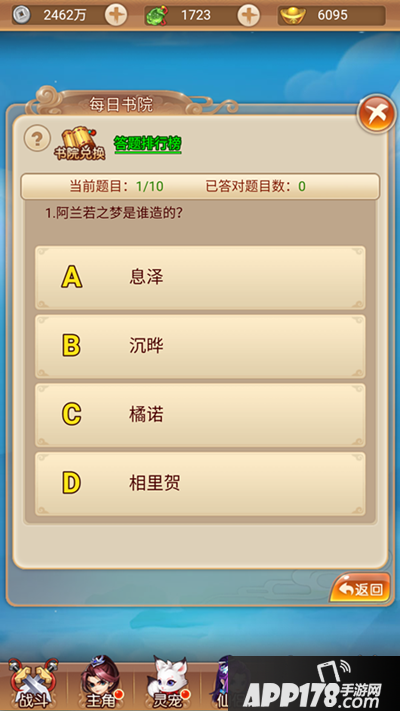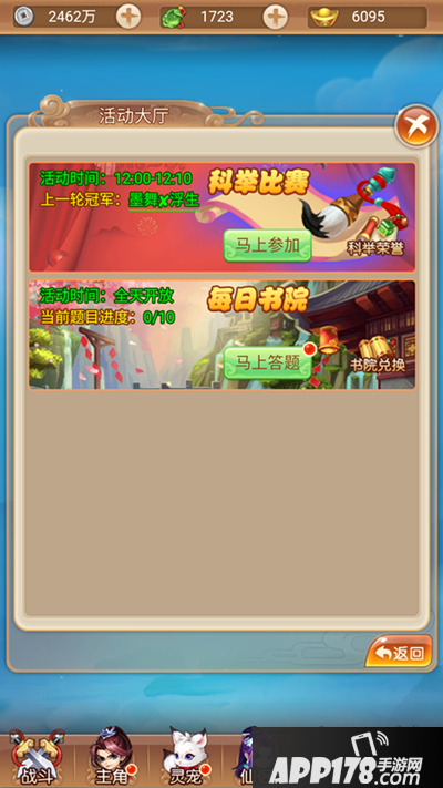 在活动大厅内,就能看到科举比赛和每日书院的入口,每日书院为55级开放。小编带着众玩家的使命,有幸提前去参与了一下“每日书院”的答题活动,并且最重要的是,冒着被研发大大关进小黑屋的风险,偷偷带来了部门题目(还不快点拿小本本记下)。