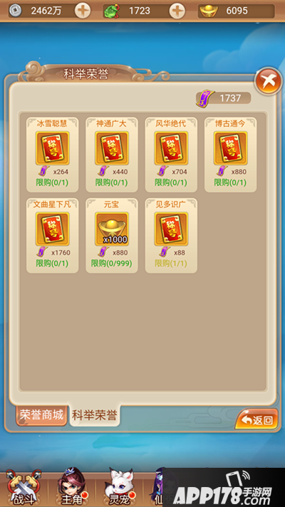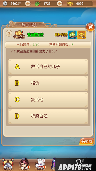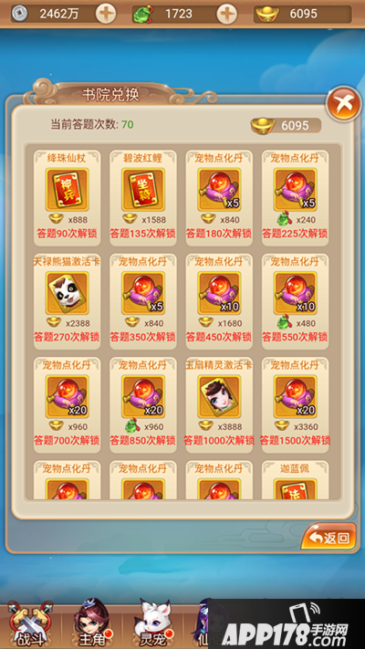 答题除了可以获得经验值、元宝这些基础奖励之外,更重要的是还可以根据答题次数解锁书院商店里的物品,包括丹药材料,甚至还有宠物激活卡!(赤裸裸的说明知识就是财富)