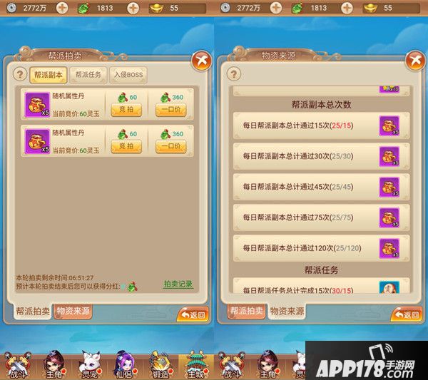 帮派拍卖中,帮派成员可以使用灵玉拍卖随机属性丹,随机属性丹打开后可获得随机丹药,而帮派拍卖上架是来源于每日帮派副本的总计通过次数,所以叫帮派的兄弟们一起来打副本吧。