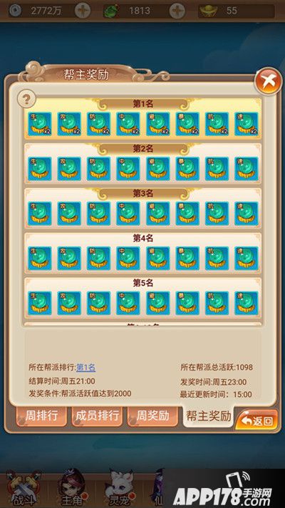 在帮派活跃度——活跃排行——帮助奖励中,可以看到具有丹药奖励,而这份奖励是针对于帮主的奖励,每周帮派活跃达到2000后,根据帮派排名,每周五21:00结算,每周五23:00发奖,算是对我们辛苦操劳的帮主大人的额外奖励了。