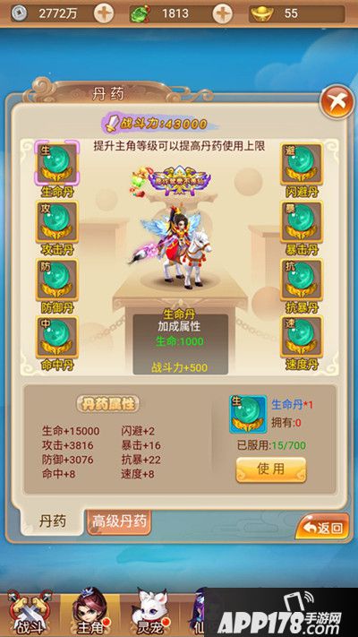 丹药系统中,对应玩家的8种基础属性(生命、攻击、防御、命中、闪避、暴击、抗暴、速度)分为8种丹药(生命丹、攻击丹、防御丹、命中丹、闪避丹、暴击丹、抗暴丹、速度丹)。