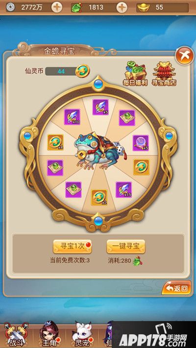 最后是最直接的丹药获取方式,即金蟾夺宝。消耗灵玉进行寻宝,会获得随机属性丹,每日有3次免费次数,除了属性丹,还可获得宝石碎片、仙灵币、仙侣进阶石等其他奖励。寻宝一次消耗40灵玉,而一键寻宝消耗280灵玉(会一次性拿到转盘中的所有奖励),而重置奖励消耗50灵玉,每日有重置次数限制。