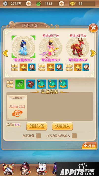 帮派2级时开放第一个帮派副本,随后帮派4级、6级、8级、12级、14级分别开放之后的帮派副本,进行帮派副本战斗,即可几率掉落丹药,前3个帮派副本掉落生命丹、攻击丹、防御丹,而之后的帮派副本便会掉落全部8种丹药。