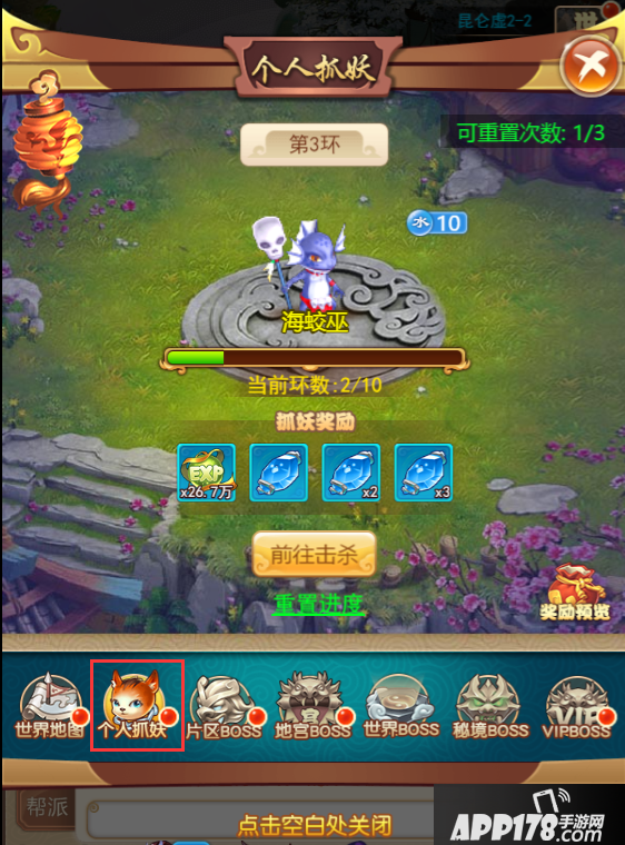 “个人抓妖”玩法入口位于世界地图界面,点击“个人抓妖”图标即可进入。玩法规则为跑环模式,共有10环,每环需要击杀一个boss,boss会分布在不同的地图中,玩家需要根据指引去到不同的地图中寻找boss并且将之击杀。
