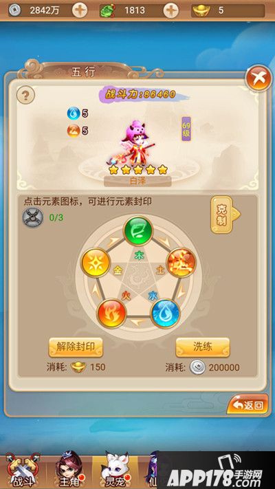 而我们如何来更好的控制我们宠物的五行属性呢?这就要考虑到宠物的“五行”系统了。可通过宠物“变异”系统,将宠物变异,然后宠物变异后,即可开启“五行”。在五行系统中,我们可以洗练宠物的五行属性,每次洗练可改变宠物的五行属性,且最多同时只会出现2种元素,每次可对至多3个元素进行封印,封印住的元素将不会进行洗练。所以,良好的利用宠物的五行,对我们进行抓妖跑环玩法事半功倍。