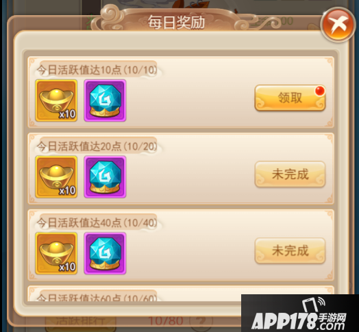 其次,根据我们每日活跃度,会获得每日的活跃度奖励,奖励内容包括元宝、天心石、帮贡。