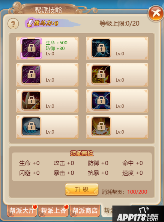 在帮派中还可以对帮派技能进行升级,消耗帮贡,升级帮派技能,可获得相应的技能效果,最终为我们提升生命值、攻击、防御、命中、闪避、暴击、抗暴、速度属性值,相当于另一种的战斗实力成长方式。而帮派技能升级需要消耗帮贡,帮贡的获取途径较为广泛,相信大家都已经了解了。