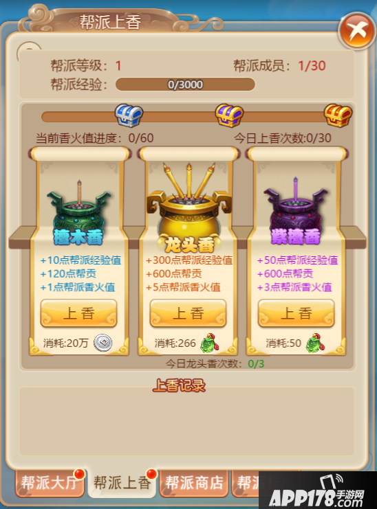 帮派建设主要分为两方面,一是帮派上香,共分为3种上香方式,檀木香(消耗银币)、紫檀香(消耗灵玉)、龙头香(消耗更多灵玉),每个帮派成员每日共有3次上香机会,但帮派每日都有30次的上香次数上限,所以每天早上起来快去抢着上香吧!