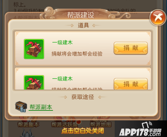 另一方面是消耗建木进行帮派建设,而建木可以通过帮派副本、帮派任务、帮派boss入侵挑战等途径获得。