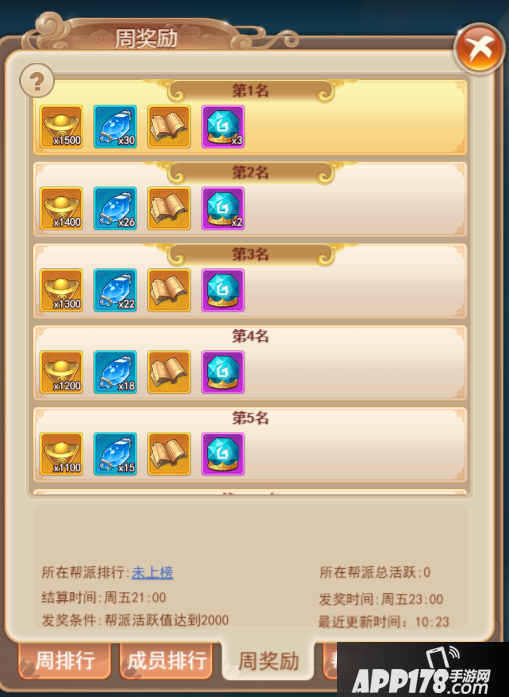 第三,我们还可以根据帮派活跃排行,获得相应的周奖励,而对于帮主,会额外获得帮主奖励。