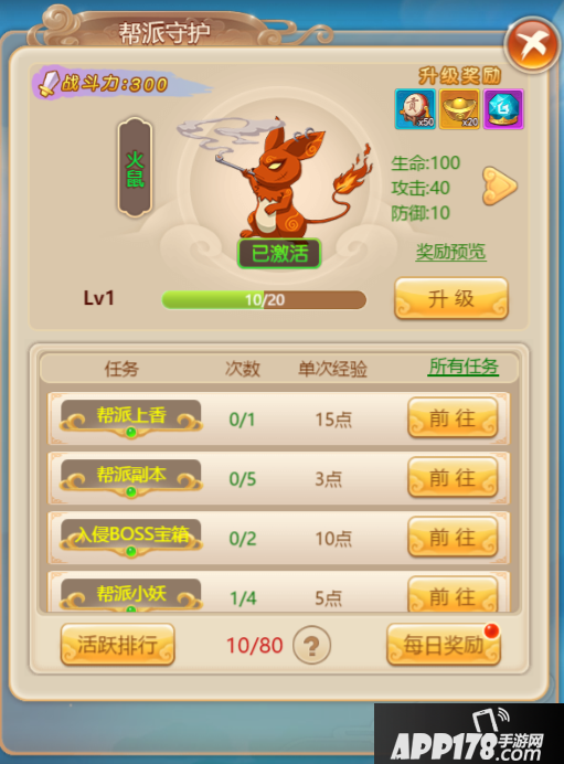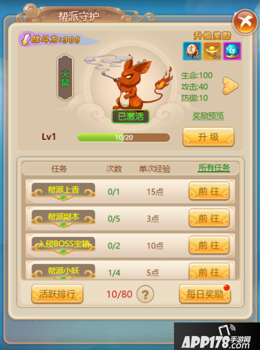 此外,我们还可以对我们的帮派守护进行升级,帮派守护升级类似于“酿酒”,即我们每日完成帮派守护发布的任务,便可获得经验值,升级帮派守护。帮派守护发布的任务均是与帮派有关,如帮派副本挑战次数、帮派上香等。