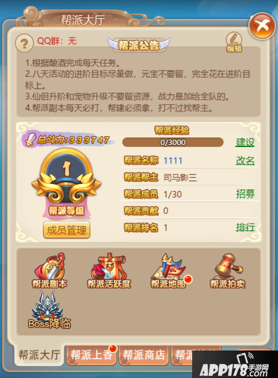 首先是帮派等级,在游戏中帮派等级的提升可以为我们提供很多方面的帮助,比如解锁帮派副本、解锁帮派商店商品和帮派福利商店商品等。而我们可以通过帮派建设提升帮派等级。