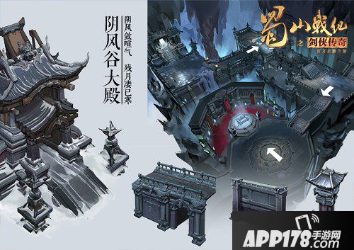 在概念图中,阴风谷大殿主要以晦暗的蓝、黑二色为主,与大殿底端的红色血池产生强烈的对比,将此地的阴森与恐怖展现得淋漓尽致。同时,又以飘雪、杂草、孤灯和怪石点缀大殿外的场景。也影射了上官警我痛失挚爱,坠入魔道后,孤寂而扭曲的内心。