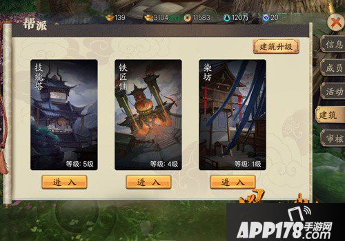 帮派建筑分为技能塔、铁匠铺、染坊,提供一系列实用可观的功能。技能塔用于研究帮派技能,帮会成员可以通过帮贡学习技能,大幅提升人物战力。铁匠铺用于装备修理,并且不降低耐久度上限。染坊可将时装染色,使你拥有独一无二的个性外观。