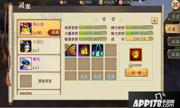 获得一只适合自己的宠物后,第一道打造工序便是还童。获得高成长和高资质以达到大幅度提高战力的目的!