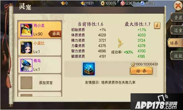 「必悟丹」厉害,直接升到这一阶段的最高级,但是材料难求,只有培养失败才有概率获得。可以根据自身的条件来选择用什么道具进行培养,这里我还是推荐稳妥起见,渐悟丹慢慢来吧~