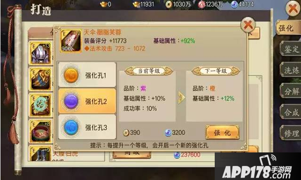 每件装备有一定数量的强化孔,等级与品阶越高,强化孔越多。随着强化孔的递进,所需要的灵气也越多。