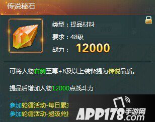 游戏在开服的时候有活动,每天冲100/300元都可以赠送一个传说密石,当装备+8之后可以使用这个道具将装备从至尊升到传说品阶,而且没其他途径可以获得,至于说提升多少战力,合不合算这个就得各位玩家自行判断了哈。
