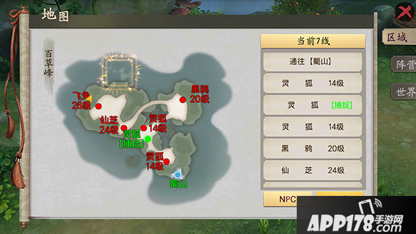 千年灵芝?在哪?于是楼楼又开始打开地图找发现地图并没有标注。于是开始地毯式搜索。终于在百草峰的一个小角落给我找到了。如图飞兔26级的数字6中间有个小黄点。小黄点就是千年灵芝的所在。除此之外,伏魔谷的地图右上角破戒弟子的一个角落里也有千年灵芝。