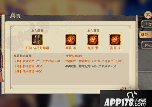 由于真言所蕴含的仙力过于强盛,因此每件装备都有其所能承受真言的极限,蓝色、紫色及橙色的装备只可镶嵌一颗真言石,道圣级别可镶嵌两颗真言石,而归神级别的装备则可在其上镶嵌三颗真言石。真言石在镶嵌之后,也可以在镶嵌界面点击真言,通过弹出的tips点击摘取将装备上的真言石取出。当拥有重复的真言石时,可通过消耗一颗同品级的真言石进行真言转化,然后随机获得一颗同句内的任意真言。