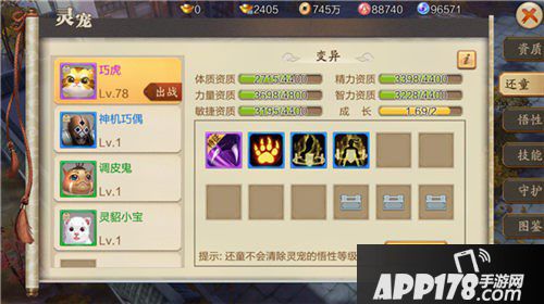当玩家获得了自己心仪的宠物之后,由于相同宠物的资质、成长不同,属性也是完全不同的,所以如何培养出一只强大的宠物作为自己的伙伴也显得至关重要。当玩家遇到资质或是成长不满意的宠物时,可以使用还童丹进行还童,还童后有几率获得更好的资质、成长、技能属性。选择还童后右边会出现还童后的资质与成长,可在对比后选择相对更好的再进行替换。