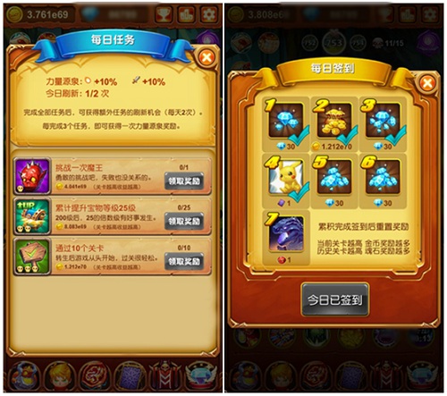 首先进入游戏最好完成每日的指定任务,将会获得十分丰厚的回报。每天3个任务,简单且丰厚,还可获得一个力量源泉,可提升英雄和宠物攻击力各10%,一直持续到转生,另外每日任务可刷新,千万别错过哦!上线要记得签到,每天都有礼物赠送,不要白不要。