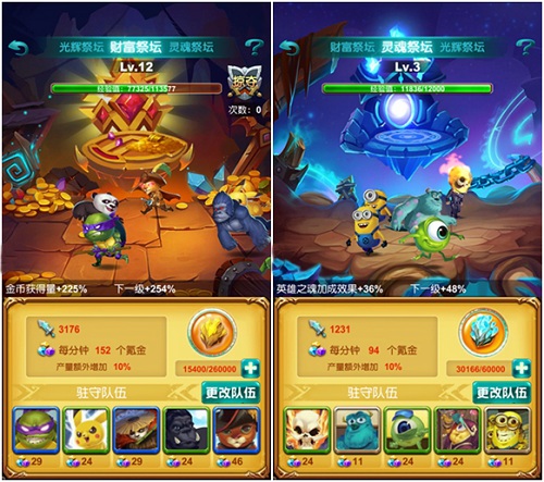 之前跟大家介绍过魔宠的一些功能,但我们还隐藏了魔宠可以镇守祭坛这个玩法,《十万个大魔王》中一共有3个祭坛分别是财富祭坛、灵魂祭坛、光辉祭坛。他们分别可以加强金币、灵魂、圣光的效果。魔宠不仅仅守护你的祭坛,还将产出最珍贵的氪金让你的祭坛更加强大。