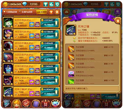 工欲善其事,必先利其器。游戏中宝物是勇者战力提升的重要保障,但不是所有宝物都值得花重金去培养,前期尽量购买新的宝物,在金币容许的情况下开启宝物专属技能,直至死神之镰的开启,它才是你的重点培养对象,你会发现,同等级别的情况下,其他宝物的攻击力跟它相差甚远。