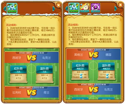 在观看扣人心弦的足球赛事过程中,跃跃欲试的澎湃心理是否此起彼伏?不用在忍耐了,自2016年欧洲杯1/8决赛开始,《十万个大魔王》将开启“足球竞猜”活动,冒险闯关的勇者同样可以参与到这万众瞩目的赛事中,凭经验拼人品竞猜球队胜负,以小博大,钻石赚不停。