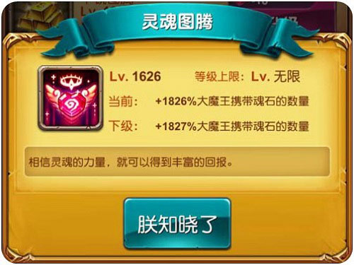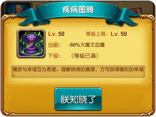 每升一级减少所有魔王的血量1%,最高50级,也就是减少50%的血量,大大的降低了大家挑战的难度,当拥有满级的疾病图腾的时候,一切魔王将不再是阻碍我们前进的障碍,召唤疾病图腾,一路碾压下去吧!