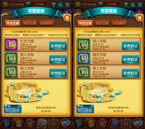 军团宝藏功能,带给大家的收获就是宠物进化所需要的材料以及万能符文。每位勇者每天有4次免费解锁宝箱次数以及6次协助解锁次数,也就是说玩家每天可以获得10次奖励。