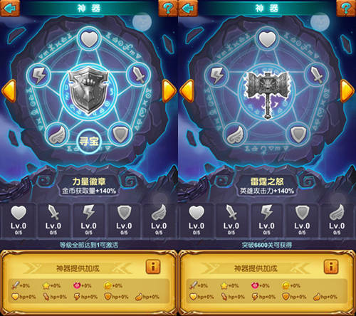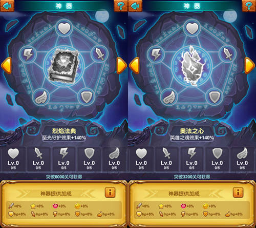 在魔王大陆的神器总共分为四大类,分别是:武器、饰品、圣典、法器!这四种神器分别代表着攻击力、金币获取、圣光守护、英雄之魂!一旦大家开启一个神器后将可以获得相应属性的提升,比如大家开启了一件武器类神器,那就将获得相应的攻击力加成!