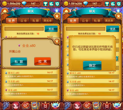 当然私聊开启的同时,还为大家开启了黑名单系统,咳咳,黑名单的作用就不用给大家解释了~看谁不顺眼,直接拉黑,瞬间天空一片晴朗,可以开开心心的闯关了~当然黑名单还是不建议大家使用的,毕竟是在一个服务器内一同玩耍的小伙伴,拉黑多不好啊~但是如果碰到传言中的“火枪手”那还是不要留情,直接拉黑吧~