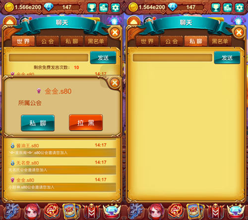 私聊窗口还是建立在原本的世界聊天界面上,大家只需要通过世界聊天中,点击想要私聊的小伙伴,将会弹出一个功能窗口,点击私聊就可以跳转到私聊界面进行你们两人之间的悄悄话啦!再也不用担心你们两人的暖味话语被别人看到了,安心的进行你们的暧昧行动吧!