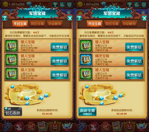 魔王大陆的宝藏被众位勇者发现后,一直被各大公会收藏着,随着战斗越发的激烈,各大公会不得不将这些宝藏公布于世,让有能力的勇者们对其进行开采!说到军团宝藏,带给大家的最大收获就是宠物进化所需要的材料以及万能符文。每位勇者每天有4次免费解锁宝箱次数以及6次协助解锁次数,也就是说玩家每天可以获得10次奖励。