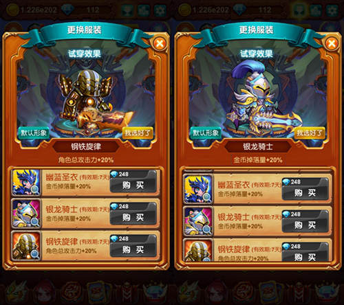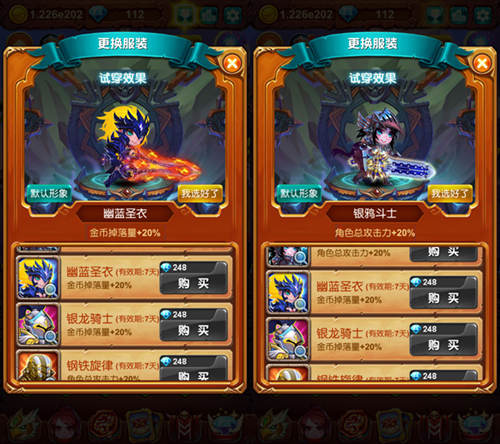 然而时装并不单单只能让勇者们变得华丽好看,它们还能为我们提供不少的属性加成,并且从数据上来看,时装的提升可以很大的。时装的加成属性分为两种:一种是增加勇者20%的攻击力,另一种是增加勇者20%的金币掉落量,这两种属性不管是哪种都可以大幅度提升我们,从而让我们在魔王大陆的闯关中力挽狂澜!