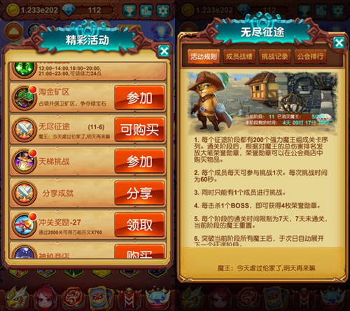 说到无尽征途,它其实就是一个挑战BOSS的活动,与我们在闯关中进行的个人挑战不同,这个活动是需要整个公会的成员一起来挑战的,只有发动全员一起进行挑战才能在规定的时间内完成任务,当击杀规定数量的BOSS后,公会的成员就可以获得大量的荣誉勋章作为奖励!