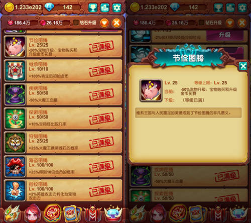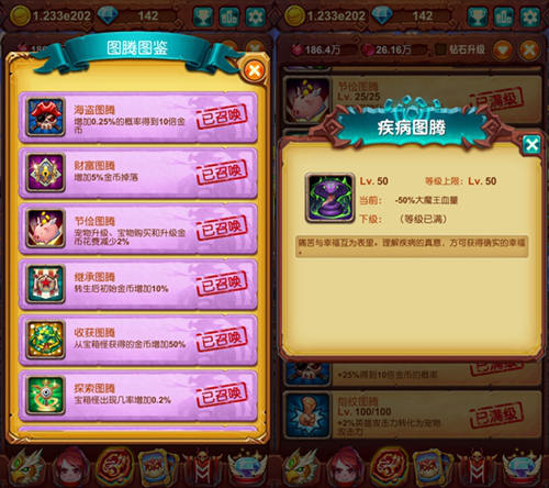 再省钱也不能帮助大家很快的进行闯关,这时大家就需要培养一个“疾病图腾”了,这个图腾每升一级减少所有魔王的血量1%,最高50级,也就是减少50%的血量,大大的降低了大家挑战的难度,当拥有满级的疾病图腾的时候,一切魔王将不再是阻碍我们前进的障碍,召唤疾病图腾,一路碾压下去吧!