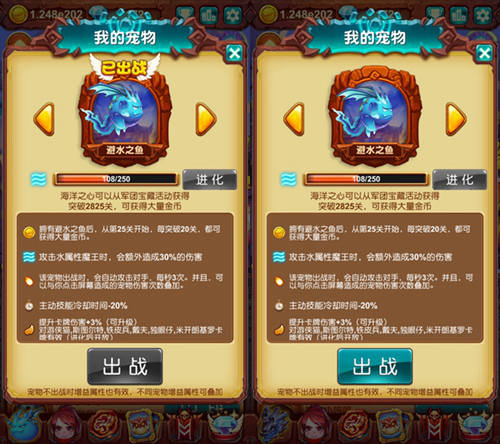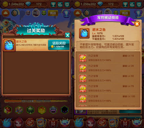 如果说避水之鱼的辅助能力让我们对它喜爱至极,那它的另一个能力就是让我们将他奉若天神!俗话说锦鲤招财,作为鱼的一种,避水之鱼也能招财,而且效果超级强大!从闯关第25关开始,没突破20关就可以通过避水之鱼获得大量的金币!是大量的金币哟!这可是一大笔的财富!对于花钱如流水的勇者们来说,拥有它就是拥有了一座金矿,而且是取之不尽用之不竭的金矿!