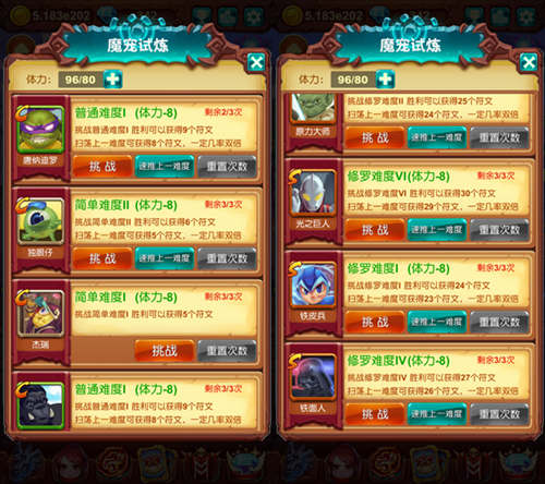 当拥有魔宠后,开启试炼,这时大家要注意,试炼也是分等级的,挑战的等级越高,获得的魔宠碎片也就越多,所以一定不要盲目的去扫荡低等级的试炼,这样根本获得不了多少魔宠碎片。这就意味着勇者们需要一直挑战更高等级的试炼从而获得更多的碎片,而随着挑战等级的提高,难度也会蹭蹭的增加,如果没有很强势的魔宠队伍,面对高难度的挑战可是很难办的,万幸的是如果魔宠试炼挑战失败是不会扣除体力的,不然各位勇者可就欲哭无泪了~