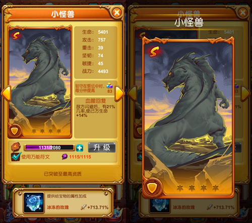 说到小怪兽,经过冒险闯关的勇者们一定不陌生,这位酷似哥斯拉的帅哥,在游戏中以凶悍的外表以及高超的属性一直被勇者们视为队伍中的主力人选!它有着很高的坚韧属性成长,使他可以完美担任团队中的肉盾,同时经过宝物“冰冻的玫瑰”的加成,可以有效的为它提供不俗的攻击力,并且本身具有回血技能,所以在后期战场上它完全就是一个像坦克一般,既抗揍又能帮忙输出的存在。