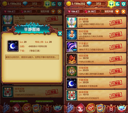 如果说雷电代表攻击,那充满月色的夜晚代表的就是高贵与平静!夜晚赏月为的就是提升心境!而神仙遗留下的“平静图腾”却是不然,图腾的中充满了月亮的光芒,可以大幅度驱散周边的魔物,帮助大家大幅度降低闯关之路上的困难!当然减少也是有一定数量限制的,当大家拥有一个20级(满级)的平静图腾时,可以减少普通关卡20个怪物!