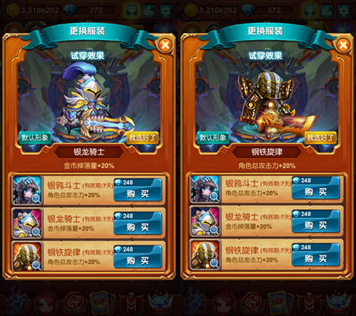 当然如果大家对闯关带来的造型不满意的话,也可以通过游戏中的时装系统,来购买并穿着自己喜欢的时装!这些时装可谓是盛气凌人,有炫酷的圣斗士,霸气的钢铁侠,甚至高贵的银龙骑士时装!分分钟助大家变身高富帅,最关键的是这些时装还都附带属性,20%金币掉落与20%攻击力增加等属性可以在闯关之旅上为大家提供非常大的帮助!