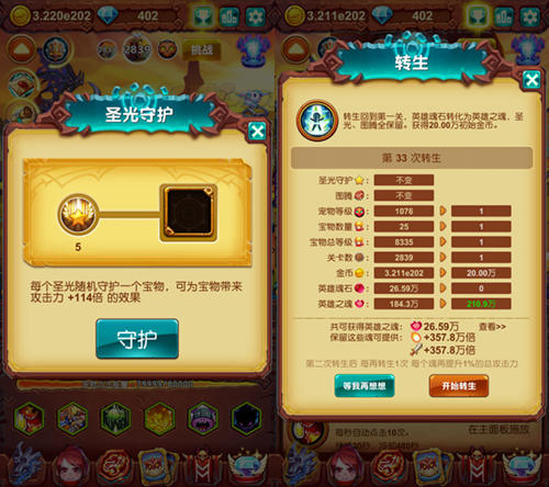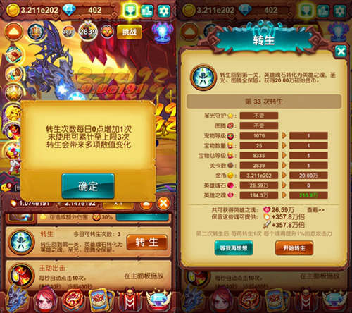 首先想要突破重重难关,需要的是高深的修为。转生作为一种可以将自己退回原点,并增加英雄之魂使自身攻击力得以积攒的手段,一直是众多勇者的最爱。但是需要大家注意一点的是,转生后,大家需要重新对自己的宝物和宠物进行升级,因为转生是会将宝物等级和宠物等级进行归零的!当然在大家转生次数达到30次并且拥有天使祝福的情况下,是可以进行原地转生的~