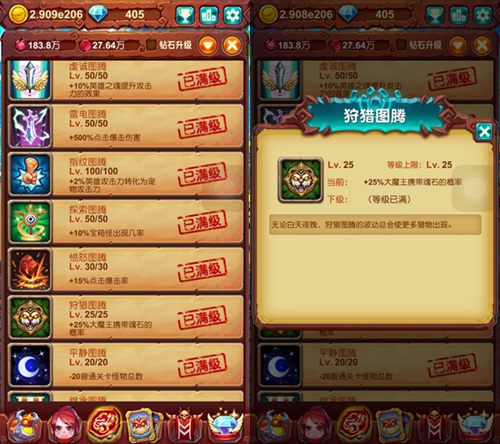 而狩猎图腾并不能直接对魔王造成伤害,但是它的作用同样不小,众所周知,挑战魔王有几率可以获得大量的魂石,这些魂石可以很好地增加勇者们的攻击力。而狩猎图腾呢,正好可以增加我们碰到魔王时,魔王携带魂石的数量,如果说之前挑战 5位魔王才能获得一次魂石,那当拥有一个满级的狩猎图腾时,3位魔王你就可以获得一次魂石。对于勇者们来说绝对是提升自身的一种利器。
