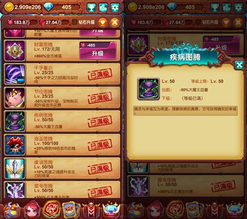 疾病图腾可以很好的遏制魔王BOSS的战斗力,正是因为有了这种图腾的存在,才使众多魔王在它面前根本没有丝毫抵抗能力。因为疾病图腾可以直接降低魔王的生命值!当升级到满级后更是一次性降低魔王50%的生命!使原本强大无比的魔王们,在它面前瞬间萎靡不振,只能任勇者宰割!