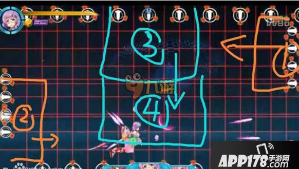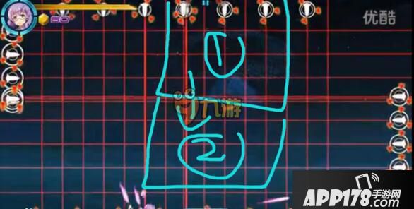 第三波导弹;如图所示,右边1的就是先出来的导弹,所以先躲在蓝色框框位置避开第一波导弹,等第一波右边导弹过了,就到躲第二波左边,第二波左边只要向下移动如图二2号橙色框格就可以