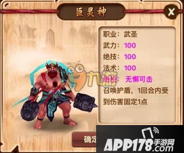 技能分析:绝招无懈可击,召唤护盾,1回合内受到伤害固定1点。从以上分析来看,小编认为巨灵神是神级伙伴中作用最小的一个,绝招召唤护盾虽然只受1点伤害,但是持续1回合,基本用处不是很大,完败杨戬的霸体3回合。不过自身输出可能会不错。