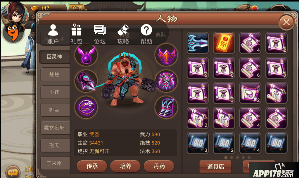 巨灵神70级,输出装为黄金,防御装为暗金,全身60级装备,血量34431,武力590,绝技490,法术360。如图: