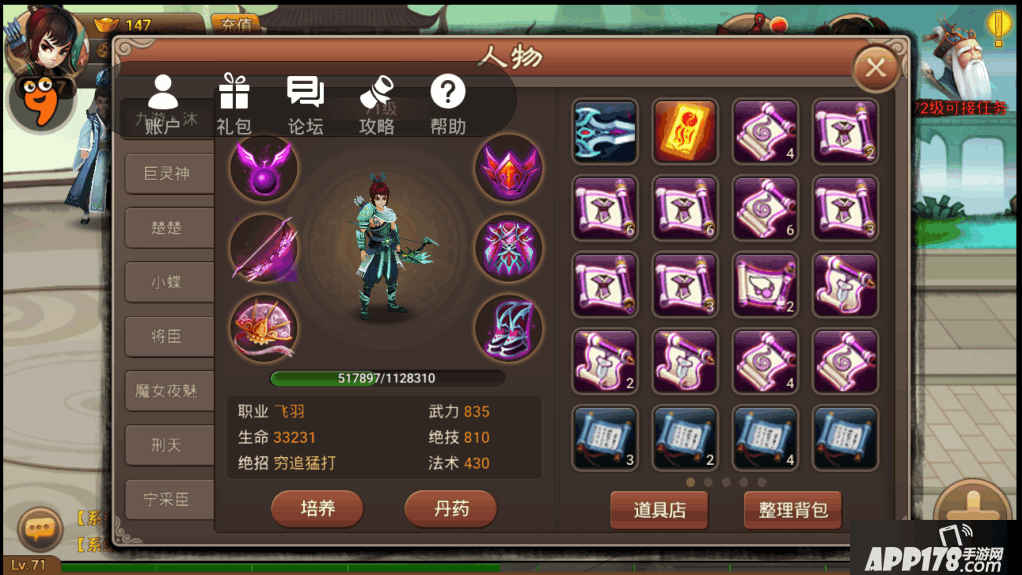 主角70级,装备全身暗金,70级武器暗金8,其余除护符70级外其余全是60级装备,技能带穷追猛打血量33231,武力820,绝技810,法术430。如图: